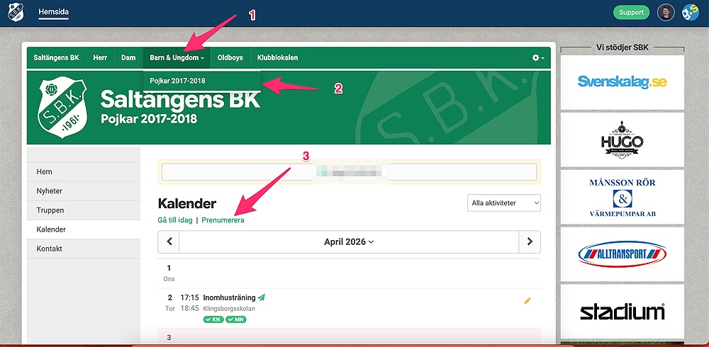 Länk till kalender på sajten: https://www.saltangensbk.se/sbk-pojkar2017-2018/kalender
